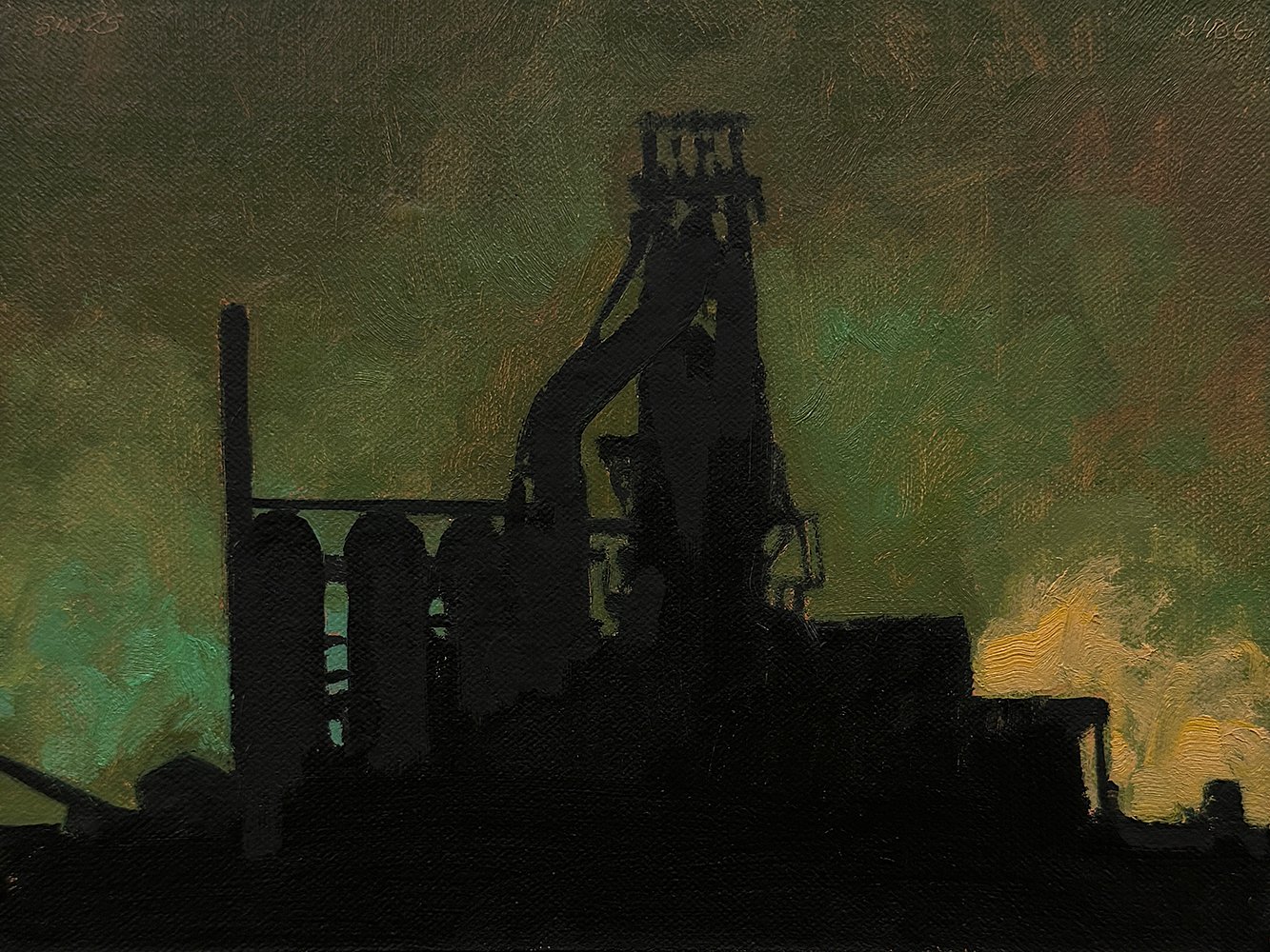 “Rouge” an original 2025 nocturne oil painting from the Postcards from Detroit series (est. 2007). Painted on a 6x8 " RayMar linen panel, this signed, titled, and dated work captures a moody nocturne view of the Rouge plant Detroit, MI. Catalog #3406. Unframed. Ideal for collectors of Detroit industrial landscapes, nocturne paintings, and original oil artworks. Please allow a few days for drying before shipment.